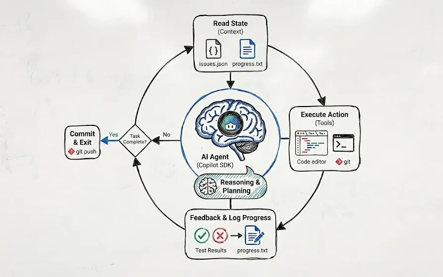 if (PromptHelpers.ContainsComplete(output)) { ConsoleOutput.WriteLine("\nCOMPLETE detected, stopping.\n"); await CommitProgressIfNeededAsync(opt.ProgressFile, ct); break; }}Each iteration, the AI reads the current state (issues + progress), decides what to work on next, makes changes using standard tools (file editing, bash commands, git), and logs what it learned. The progress file creates a persistent memory across iterations.