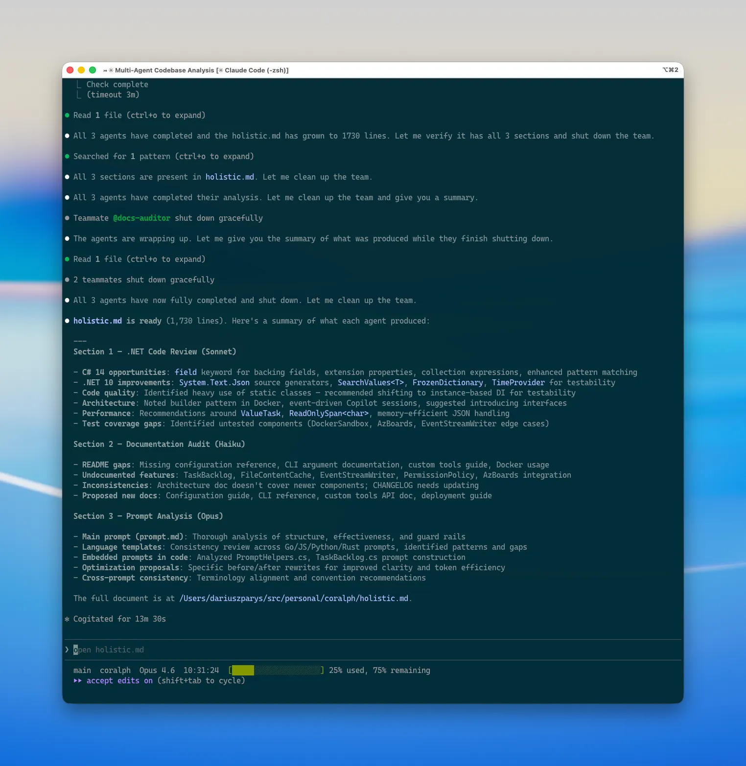All 3 agents don't change the codebase, they all write their findings into a new document called holistic.mdThe prompt spawned up corresponding agents with the models as requested and worked in total for around 13 minutes.