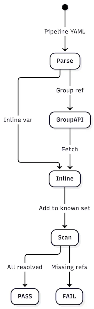 The linter parses your YAML, identifies all variable sources (inline definitions and group references), queries the Azure DevOps API to fetch actual variable group contents, and then scans for any $(variable) references that can’t be resolved.